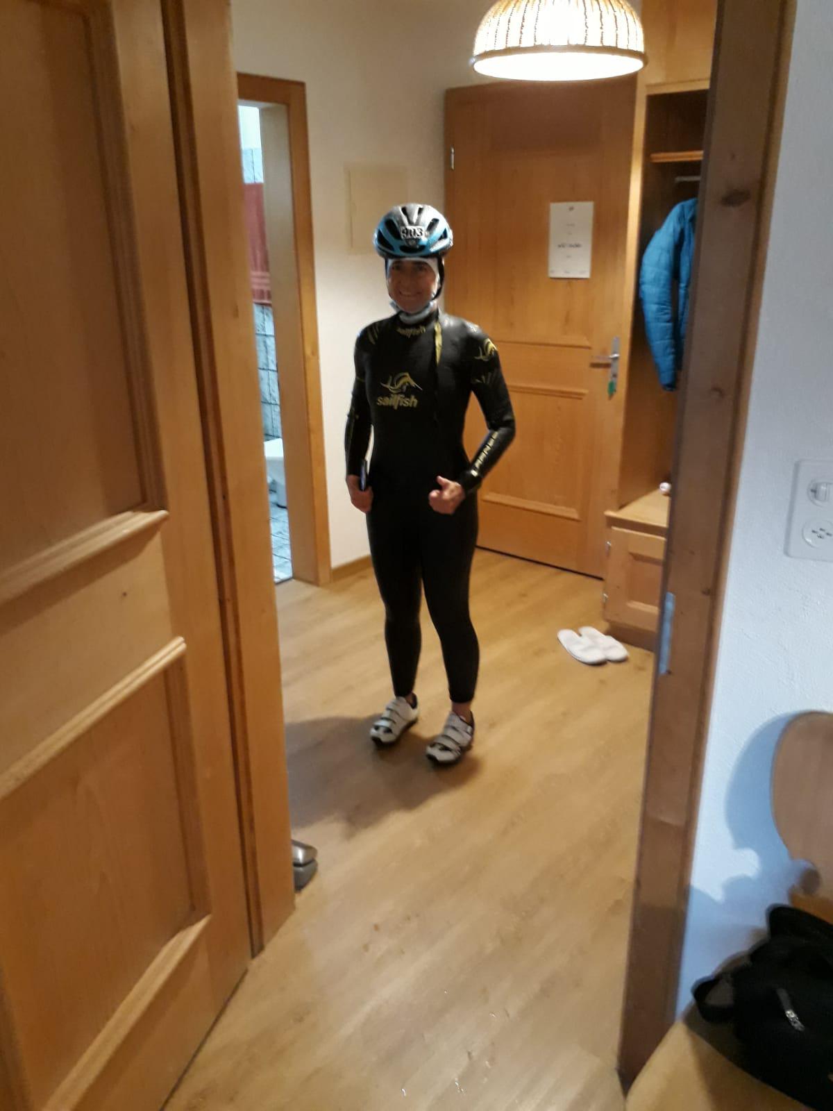 Zurück vom Check-out mit Neopren und Badekappe nach Haus geradelt: