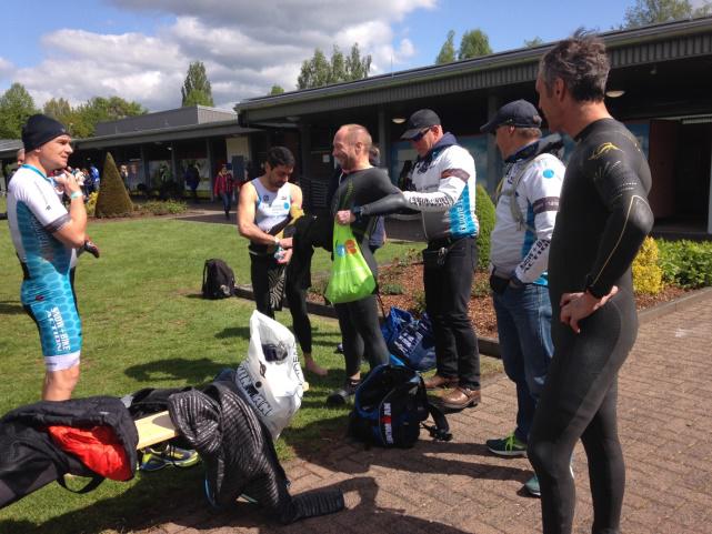 Aufgrund der Witterung war das Tragen eines Neoprenanzugs beim Schwimmen erlaubt und kurzfristig hatten die veranstaltenden Wasserfreunde Fulda noch ein Umkleidezelt in der Wechselzone aufgebaut. So zwängten sich dann unsere Starter in die Chlorbutadien-Kautschuk-Ganzkörperhülle |