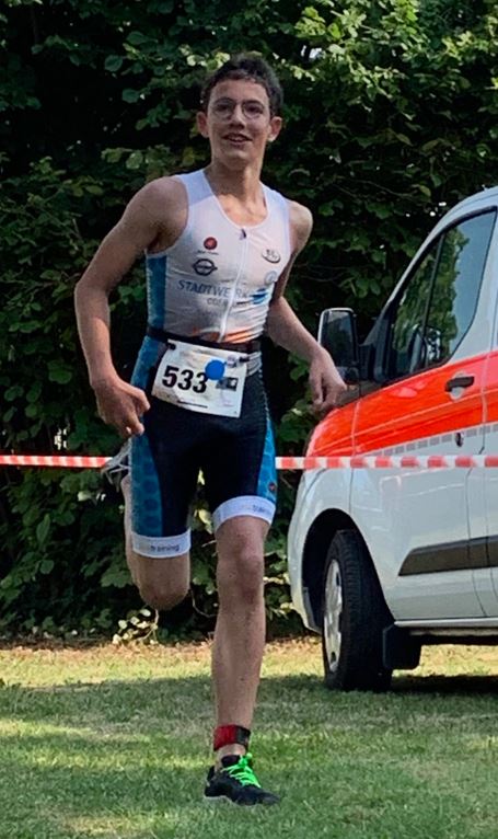 waren zeitgleich nach 200m Schwimmen in 5:30 Minuten „first out of water“ ihrer Altersklasse und flitzen zur Wechselzone, um den anschließenden 1000 Meter Lauf in Angriff zu nehmen. Keanu konnte seine starke Laufform bestätigen und lief als erster seiner Altersklasse mit einer starken Endzeit von 12:03 Minuten ins Ziel. Lukas folgte mit lediglich 28 Sekunden Rückstand auf Platz 3. Er musste sich auf der Laufstrecke wegen Seitenstechen, Jonas Kristel aus Bruchköbel auf Platz 2 um nur 5 Sekunden geschlagen geben.
