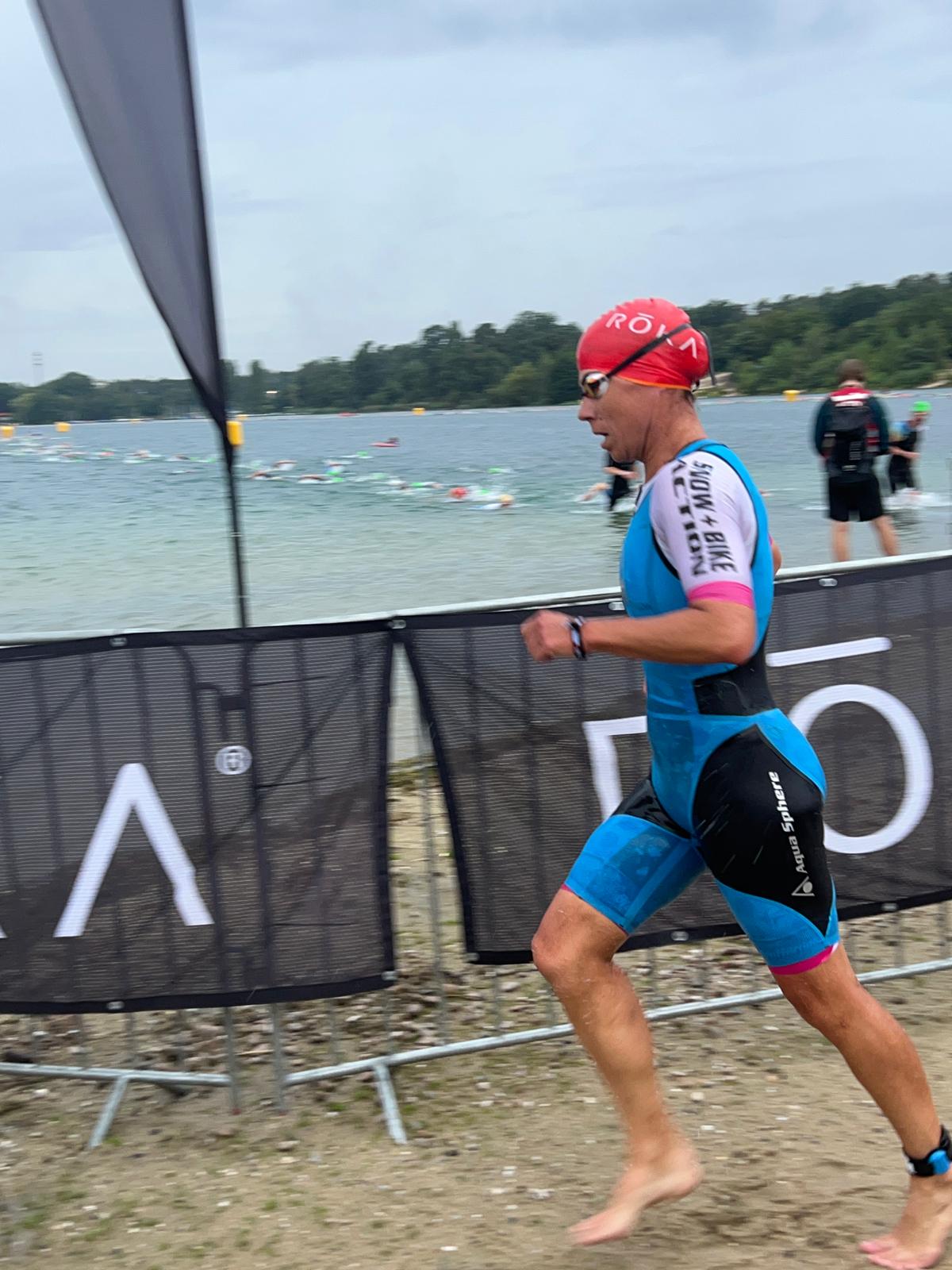 Um 6:35 Uhr ging für sie der längste Tag des Jahres los. Aufgrund der warmen Wassertemperatur von 26,1 Grad war das Tragen eines Neoprenanzuges verboten. Die ehemalige Leistungsschwimmerin schwamm die 3,8 km in 59:15 min. und stieg als erste Frau ihrer Altersklasse und als 4. Frau gesamt aus dem Wasser.