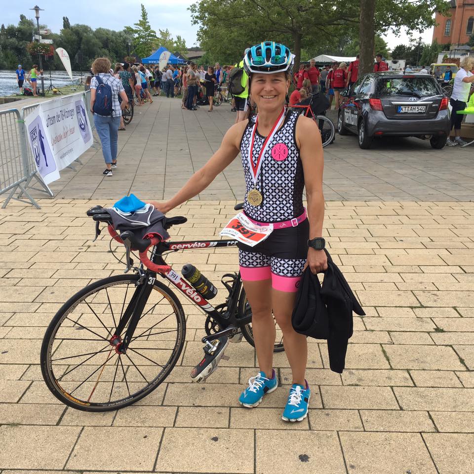 Nachdem Miriam Sauerwein kurzfristig ausfiel, wurde Claudia Richter, die auf Ihrem Rückweg von Nürnberg nach Bad Homburg war, am Freitagabend gegen 22:00 Uhr von einem Spontanstart in Kitzingen überzeugt – Laufschuhe und Schwimmbrille hatte sie immerhin mit. In einer nächtlichen Gemeinschaftsaktion der drei Damen wurde die restliche (Leih)- Ausrüstung (Fahrrad, Radschuhe usw.) für die Mannschaftskapitänin des SC Oberursel zusammengestellt, so dass Claudia Richter und Stefanie Heinke gemeinsam in Kitzingen starten konnten.