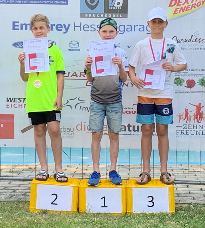 waren zeitgleich nach 200m Schwimmen in 5:30 Minuten „first out of water“ ihrer Altersklasse und flitzen zur Wechselzone, um den anschließenden 1000 Meter Lauf in Angriff zu nehmen. Keanu konnte seine starke Laufform bestätigen und lief als erster seiner Altersklasse mit einer starken Endzeit von 12:03 Minuten ins Ziel. Lukas folgte mit lediglich 28 Sekunden Rückstand auf Platz 3. Er musste sich auf der Laufstrecke wegen Seitenstechen, Jonas Kristel aus Bruchköbel auf Platz 2 um nur 5 Sekunden geschlagen geben.