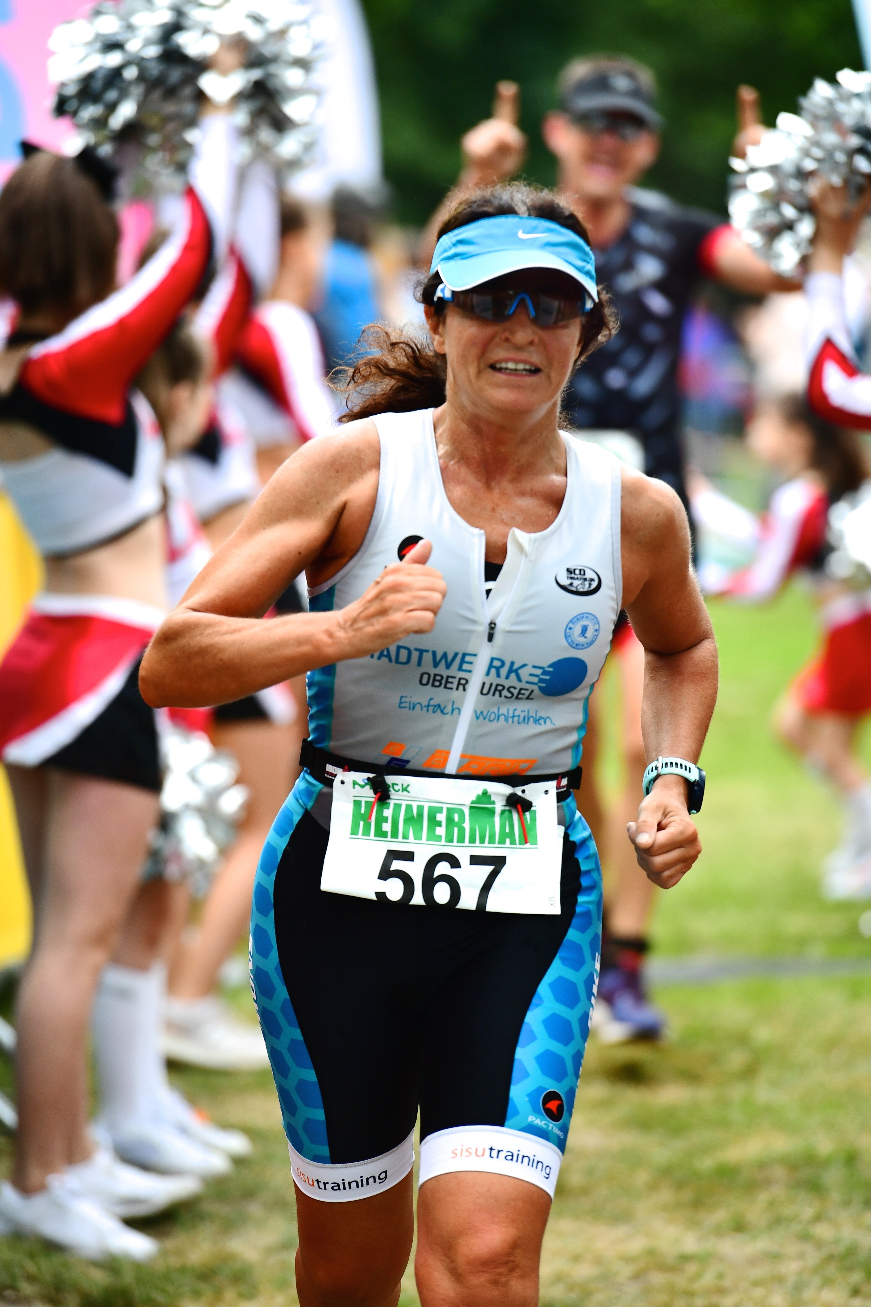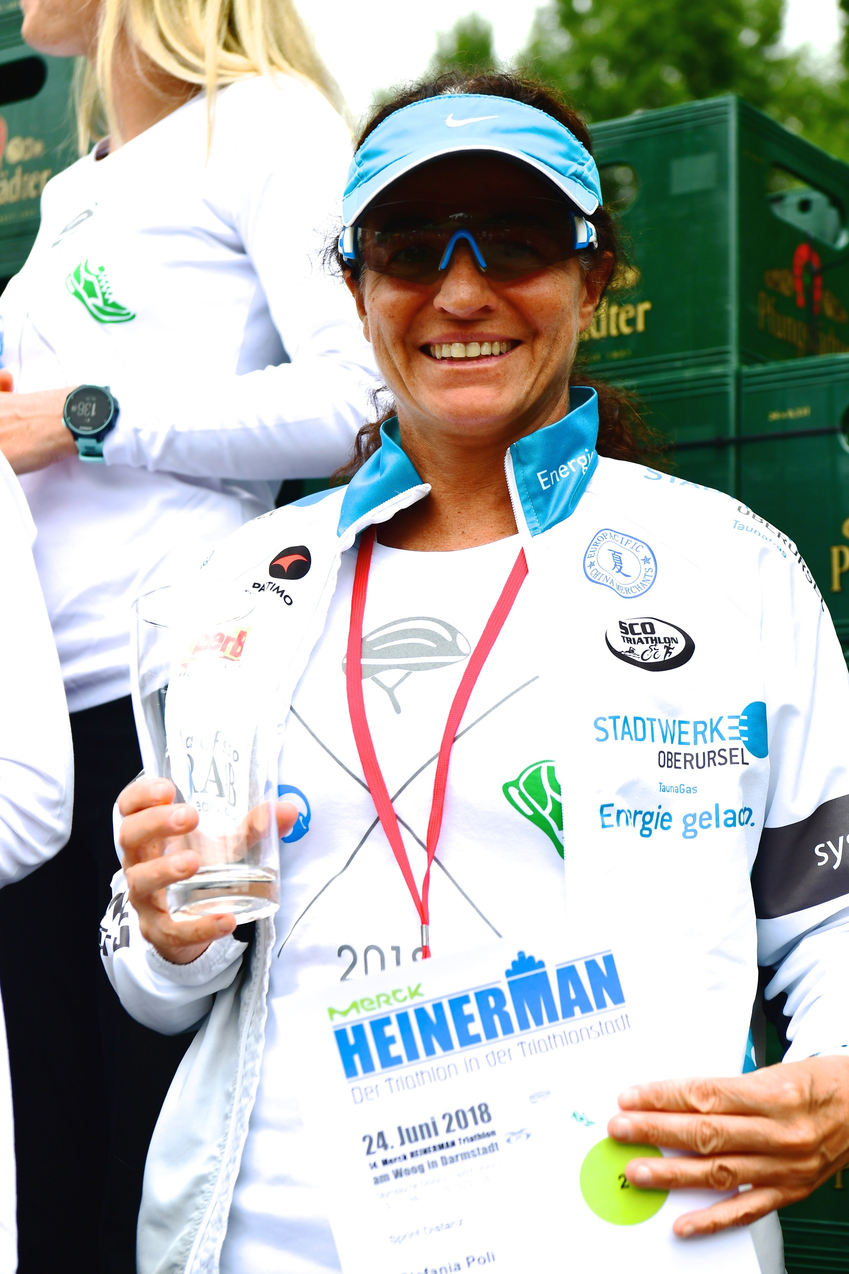 Diese setzt sich zusammen aus 0,75 km Schwimmen im großen Woog, 26 km Radfahren mit mehr als 200 Höhenmeter und 5 Laufkilometer. Sie erreichte in ihrer AK W45 den zweiten Platz mit einer Gesamtzeit von 1:49:17 (16-56-31).